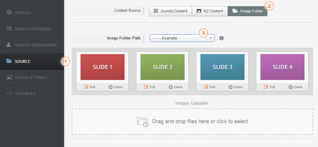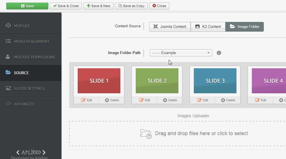 This is the fastest way to create your slider. Select the content source for module, if you choose "Image Folder", set the image folder path. If you have prepared images in selected folder, AP Smart LayerSlider will render them all. If you don't have images in folder, then you can use Drag-and-drop uploader to upload multiple images at once.