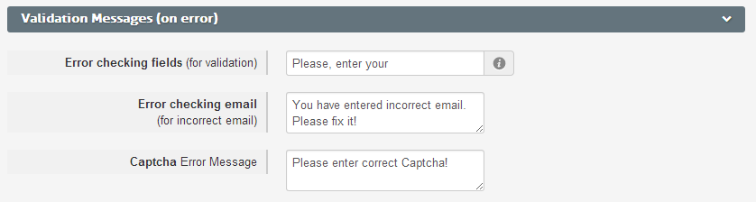 - Captcha Error Message - Enter here custom error message for Captcha (if Captcha is enabled).