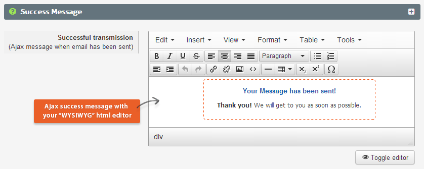 Successful Transmission Message - This is an ajax message when email has been sent. You can enter here a custom "Success" message with html code in your WYSIWYG editor.